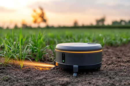 A modern automated gardening device designed for precision agriculture rests in a sunlit field. This innovative tool enhances farming efficiency and promotes sustainable practices.
