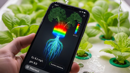 Smartphone showing close-up of hand holding smartphone displaying kale plant root data with ar...