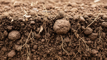 Explore the captivating layers of soil showcasing organic material and natural processes. The rich textures and colors reveal the complexity of earth's hidden ecosystems.