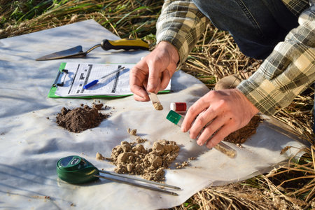 taking a soil sample for a soil test in a field. Testing carbon sequestration and plant health in Australia