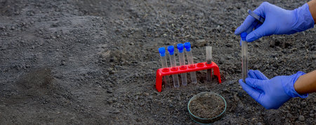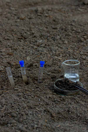 Test tube with sample of soil, closeup. Chemical elements above earth. Composition analysis