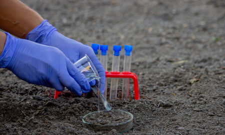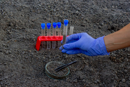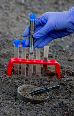 Soil testing. Agronomy Specialist taking soil sample for fertility analysis. Hands in gloves close up. Environmental protection, organic soil certification, field work, research