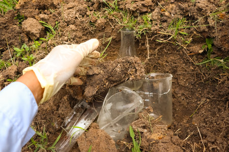 Scientist taking sample of soil for research outdoors, closeup. Chemical elements around. Composition analysis