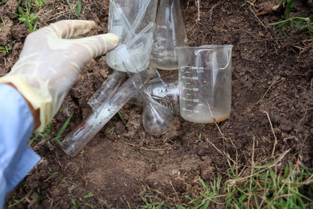 Taking the substance for analysis. Gloved hands holding the tube with liquid substance. Background dump garbage