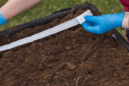 Agrochemical examination of agriculture sample in laboratory. Female scientist measuring ph of sample with litmus strips