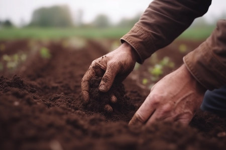 close-up of farmers hands, tilling the soil and preparing for a new season, created with generative ai