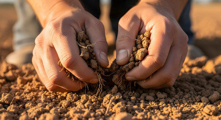 Close-up view of weathered hands working the soil, emphasizing the connection between man and earth in agriculture. The scene captures dedication and vitality.