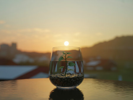 A clear glass filled with a dark beverage sits on a reflective surface, mirroring a soft, golden sunset.