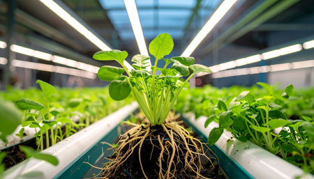In a state-of-the-art vertical farm, a vibrant green plant thrives under the glow of advanced LED lights. Its healthy root system is on full display, showcasing the efficiency and promise of hydroponic technology for the future of sustainable, urban agriculture.