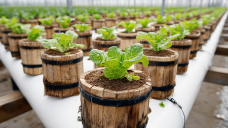 Rows of young lettuce plants are displayed in cylindrical wooden pots within a greenhouse. The fresh green plants are arranged in an orderly fashion. The image displays natural sunlight illuminating the scene with a shallow depth of field. This image is suitable for use in agricultural or environmental publications.