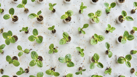 An overhead view of multiple seedlings just starting to sprout in a seed tray, arranged neatly on a white background
