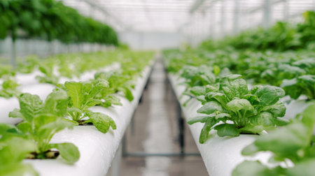 Rows of vibrant green lettuce plants cultivated in a modern hydroponic system, showcasing sustainable agriculture and efficient food production.