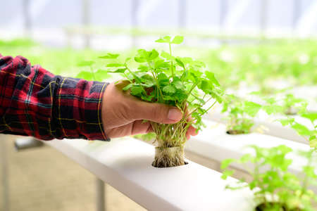 Farmer hand harvesting hydroponic vegetable plant (Coriander or Cilantro) in hydroponic greenhouse