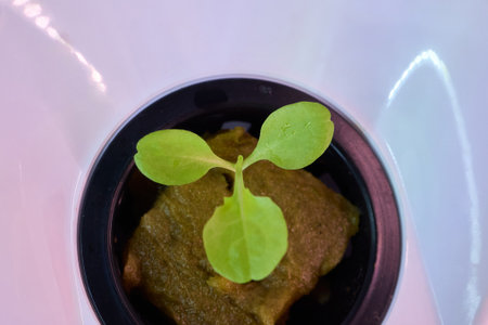 This image showcases a collection of young green plants in black pots, thriving in an indoor hydroponic system, symbolizing sustainable agricultural practices for modern urban environments.