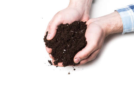 Brown soil in woman hands isolated on white background. The soil falls out of hand.