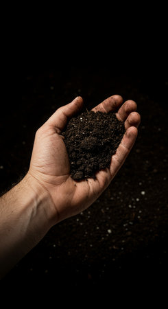 Hands holding dark soil, symbolizing connection to nature and earth. rich texture of soil conveys sense of nurturing and growth, evoking feelings of sustainability and environmental awareness