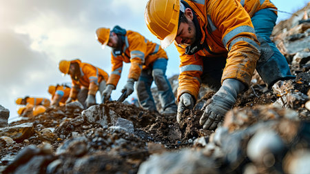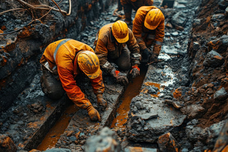 Builders wearing protective gloves labor in thick mud, skillfully excavating the ground. The challenging conditions reveal their determination and commitment to the project.