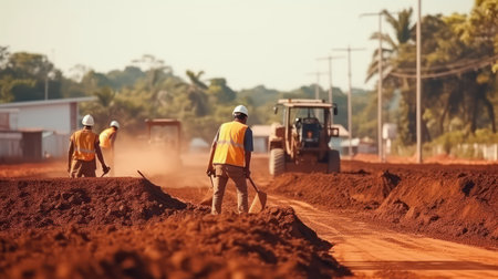 Team of engineers and construction workers working on a road construction site.