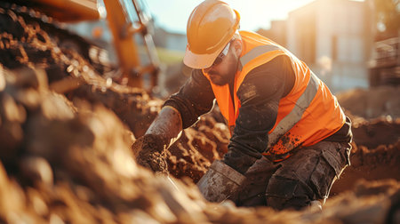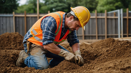 A construction worker kneels on the ground at a residential construction site, carefully digging and examining soil. He wears a bright vest and hard hat, ensuring safety while working diligently.