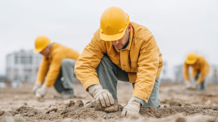 A group of construction workers wearing yellow hard hats labor diligently at a building site, digging and preparing the ground, showcasing hard work and teamwork.