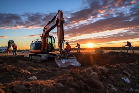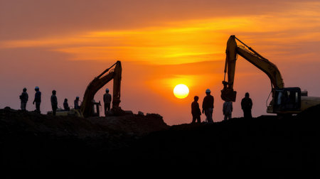 A striking image of construction workers silhouetted against a vibrant sunset, highlighting teamwork and heavy machinery in action on an active site.