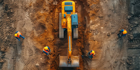 An AI generated illustration of Construction workers gathered around a large excavator at a work site