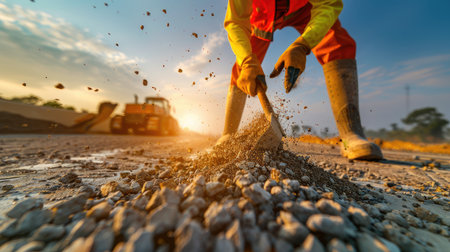 A construction worker uses a shovel to move gravel at a roadwork site during a stunning sunset. The atmospheric light enhances the industrious scene, showcasing hard work and commitment.