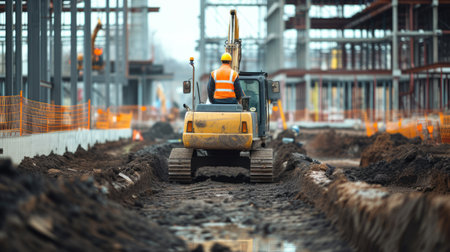 A man is operating a bulldozer at a construction site, shaping the soil for building a house in the city. AIG41