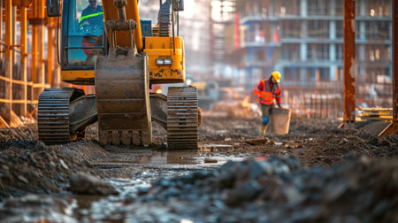 A bustling construction site featuring heavy equipment and workers actively engaged in digging and building in an urban environment. Safety gear is prominent.