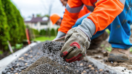A construction worker skillfully spreads gravel for landscaping in a residential area. Bright colors and teamwork define this outdoor project focused on ground preparation.
