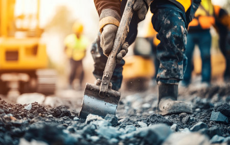A construction worker shovels gravel on a worksite, showcasing safety gear and focused effort amidst a vibrant outdoor backdrop, reflecting industry dedication.