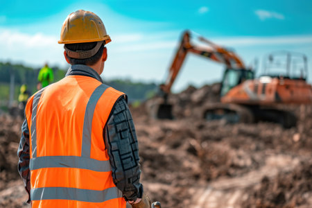 Back of construction worker or engineer on construction site with excavator
