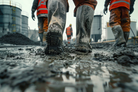 Workers in muddy boots walking on construction site, focused on teamwork and safety. Industrial background with storage tanks and machinery.