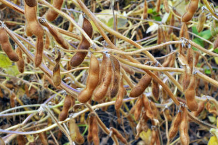 Ripe soybean plant in field with pods ready for harvest, selective focus