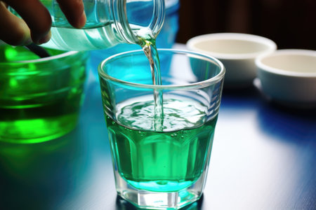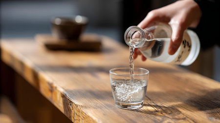 Pouring water from bottle into glass on wooden table, closeup.ai generated