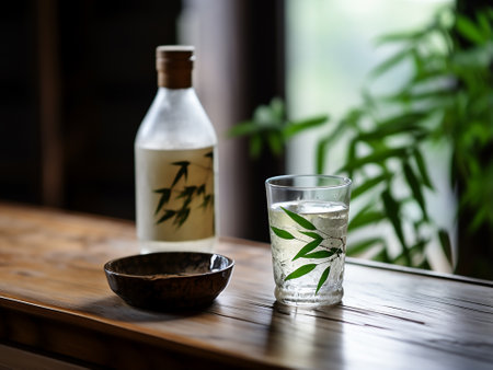 Glass of water with bamboo leaf and bottle on the wooden table.