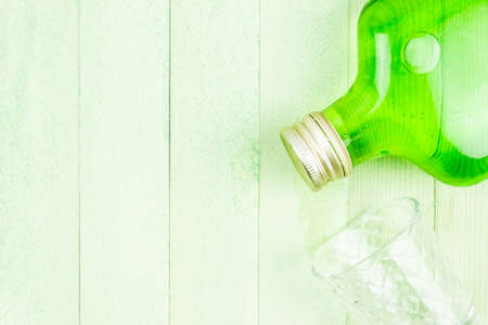 Glass bottle with green absinthe drink on the table. Copy space for text