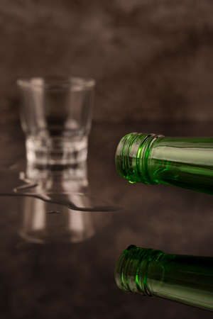 Cold vodka glass on a dark background in the neon light or glasses of russian vodka on bar background. selective focus