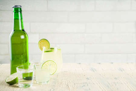 Traditional korean alcohol drink soju with soju-lime cocktails on light concrete background copy space