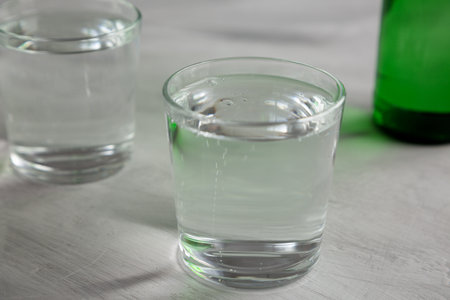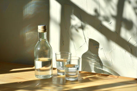 Serene morning light casts artistic shadows on a bottle and glasses of water, creating a tranquil ambiance. Experience the gentle play of shadows and reflections. Generated A.I.