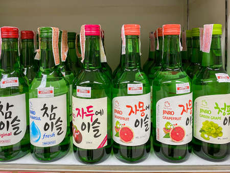 Bangkok Thailand - 01 Sep 2020: Many flavor of Soju on shelf for sale in the supermarket, Soju is traditional Korean drink made of rice, Wheat or barley