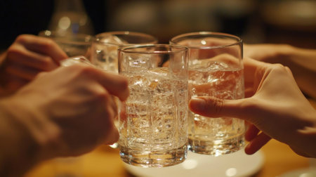 A heartfelt moment as a team member gives a heartfelt speech with others around the table raising their glasses filled with sparkling water in a toast symbolizing unity and shared succes