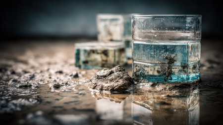 This artistic still life features clear glasses filled with water resting on a muddy surface, showcasing unique textures, reflections, and a serene ambiance.