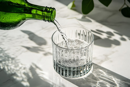 Sunlight casts shadows as sparkling water is poured from a green bottle into a crystal glass placed on a elegant marble surface, creating a refreshing moment.