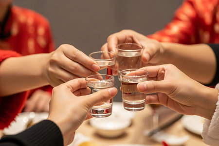 Hands toasting with traditional Chinese liquor glasses during a warm banquet symbolizing reunion and future fortune.