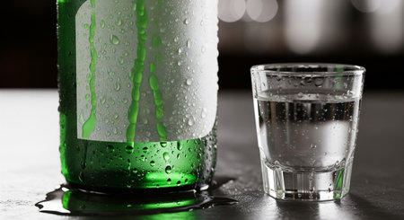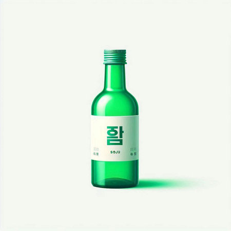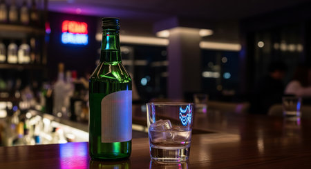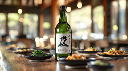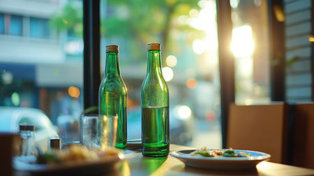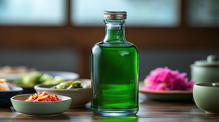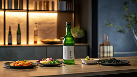 Traditional green soju bottles next to small plates of Korean side dishes, featuring bold flavors and vibrant colors in a cozy setting.