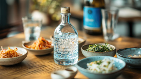 Soju bottle placed with Korean side dishes like seasoned sprouts, kimchi, and seaweed, creating a traditional, vibrant dining setup.