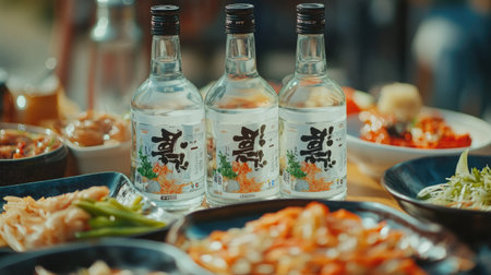 Close-up of soju bottle on a table filled with small plates of Korean side dishes, creating a vibrant and authentic dining experience.