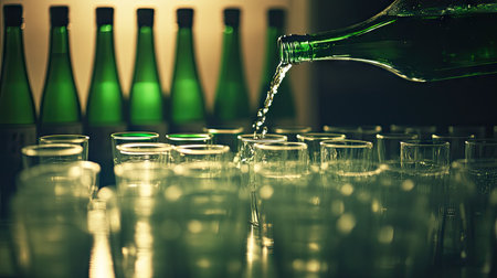 A sequence of soju bottles and glasses arranged neatly, with one being poured in the center of the frame.