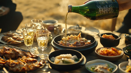 A scenic outdoor picnic scene with soju being poured into glasses, surrounded by Korean BBQ dishes.